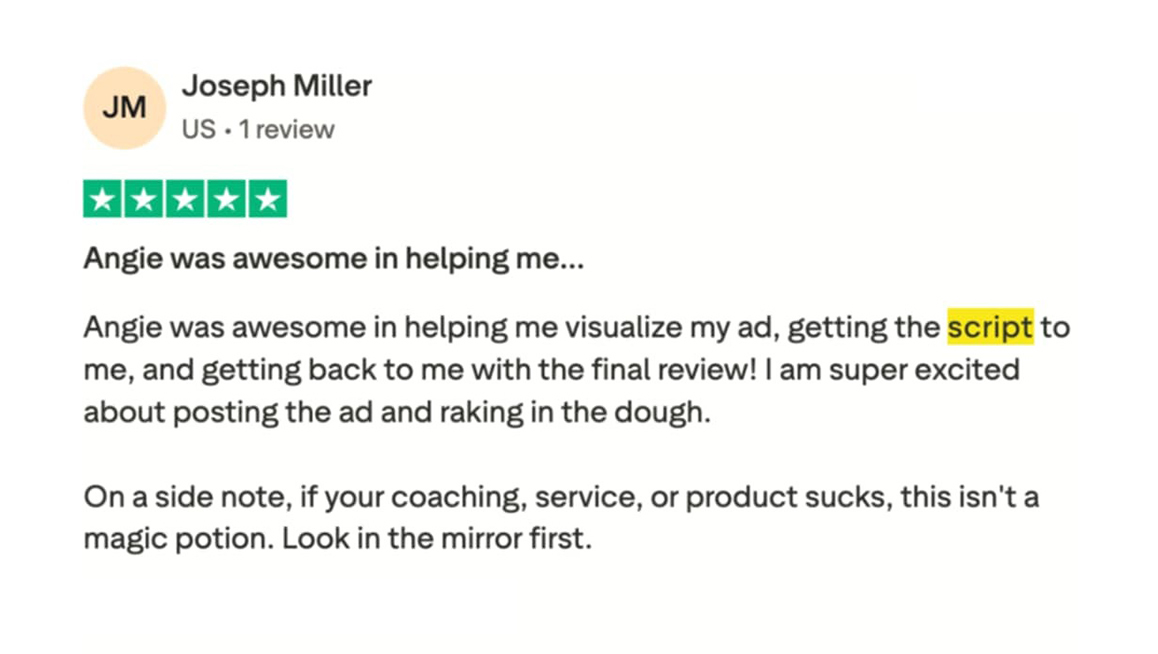 You have 30 days from the day you receive your script to implement it. If, after running the ad, you can show us it did not outperform your current best-performing ad, we will happily refund your $97. It's that simple.